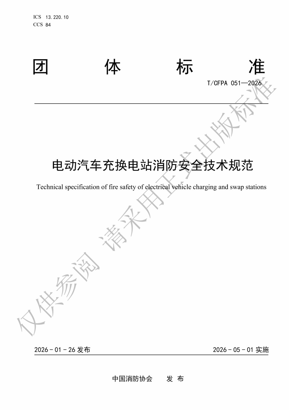 2026年1月27日,中国消防协会正式发布《电动汽车充换电站消防安全技术规范》(T/CFPA 051-2026),该标准将于2026年5月1日起正式实施。
