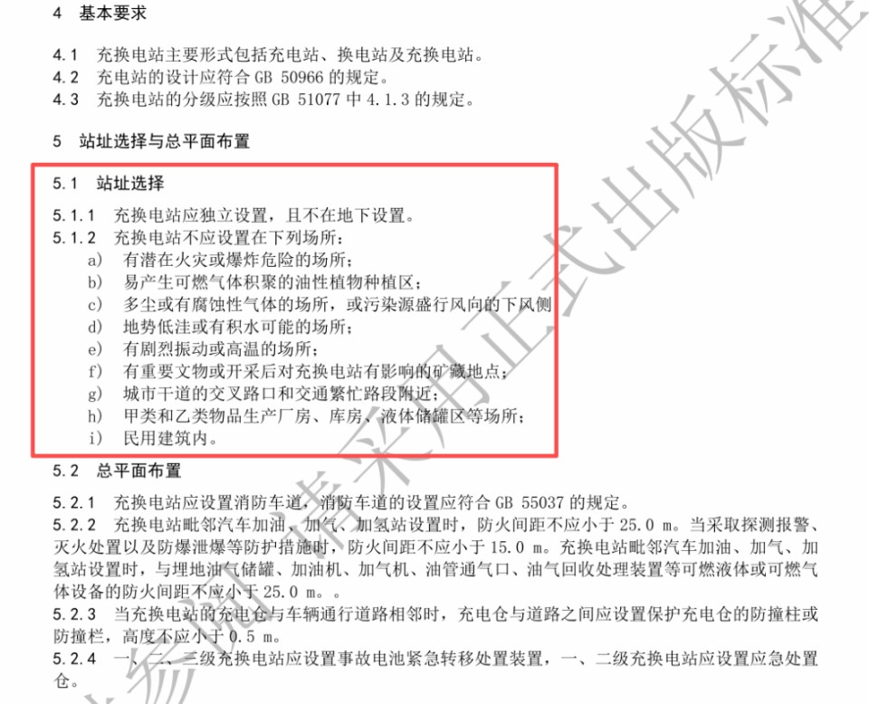 在站址选择方面,《规范》明确要求充换电站应独立设置且不得建于地下,严禁设置在民用建筑内,同时列明了九类禁止选址场所,包括有潜在火灾爆炸危险的区域、易产生可燃气体积聚的油性植物种植区、城市干道交叉路口等。