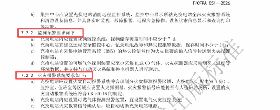 《规范》对火灾监测预警提出具体要求:充换电站应设置视频监控系统,视频储存时间不少于7天;宜建立远程安全监控中心,电池故障和热失控报警数据保存时间不少于1年;应采集电池管理系统(BMS)的热失控信号作为火灾报警输入,可燃气体探测装置应至少采集氢气或一氧化碳气体。