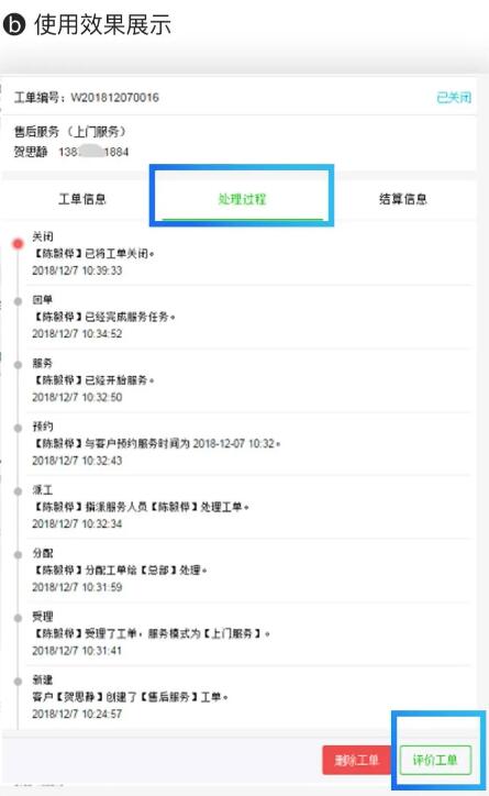 在报修过程中,客户可以在公众号上随时查看报修进度,并可对服务进行满意度评价。信息化的工单记录与服务评价,实现可跟踪、可追溯的服务,从而提升管理水平与服务质量。