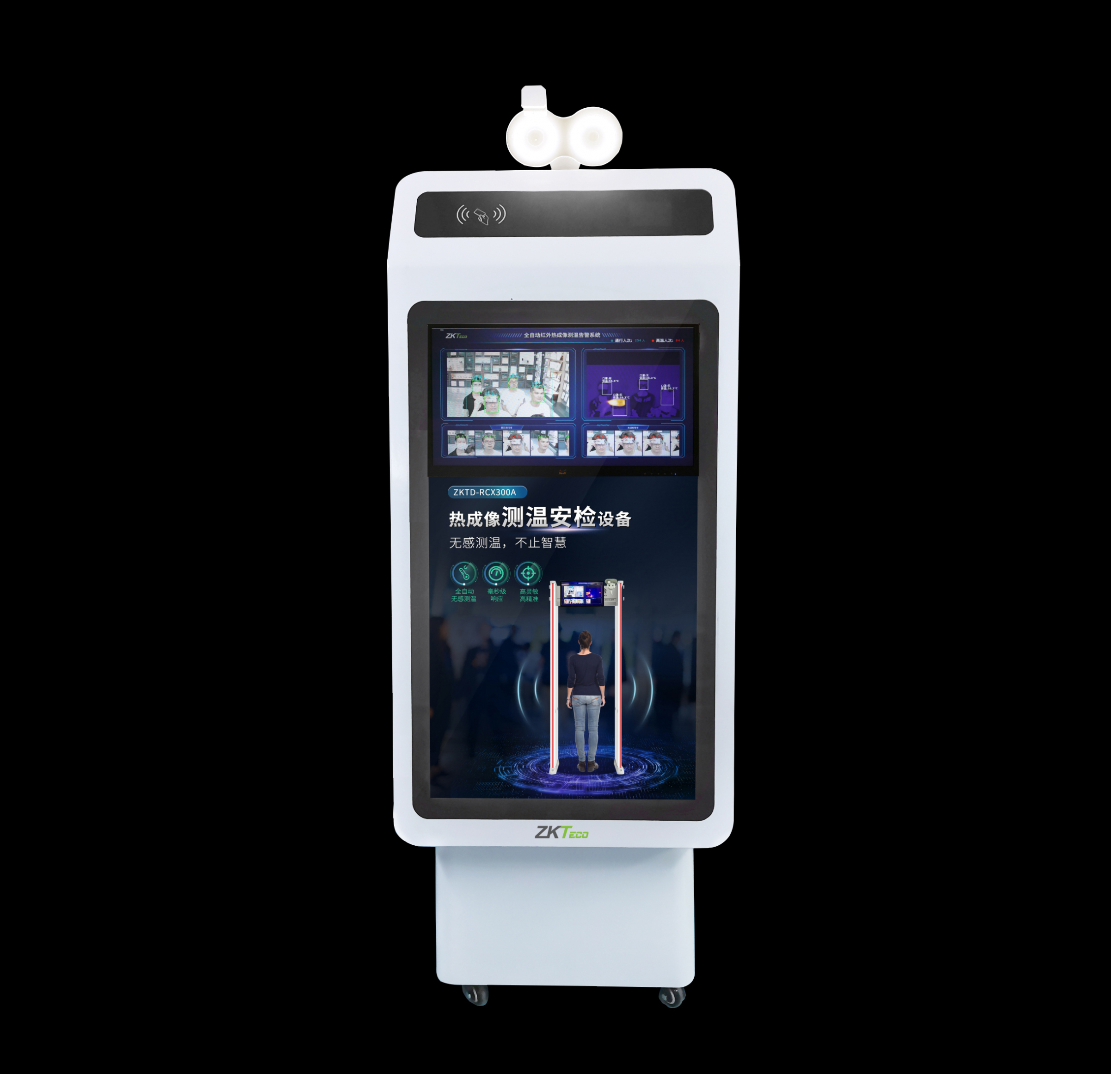 ZKTD-RCX400R测温机器人,采用高灵敏度红外热成像探头及人工智能自动测温算法,实时自动识别人脸输出测温结果,快速毫秒级检测额头热感温度,自带黑体,热感测温精确度为±0.2℃。同时,基于人工智能技术的自动温度算法,它可准确识别和统计路过的人数,并快速分析显示个体人员温度,对于体温超标人员,对其进行红色标记并实时报警。此外,这款防疫卫士同一时刻检测顶多可支持20人,系统测温快、精度高、多人同时测温,确保人行畅通无阻,在大流量通行场景下的优势不言而喻。