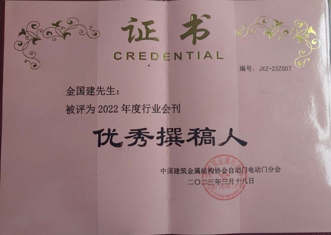 盛典现场,广东金鸿星智能科技有限公司董事长金国建先生被聘为中国建筑金属结构协会技术顾问并斩获多项殊荣,其中获评「2022年度自动门电动门分会优秀副会长」、「户外人行智能平开门参编单位」、「自动门电动门行业特别奉献奖」,金鸿星董事长金国建荣膺「2022年度行业会刊优秀撰稿人」称号,这些殊荣充分肯定了金鸿星在中国自动门电动门行业的卓越地位及深厚影响力。