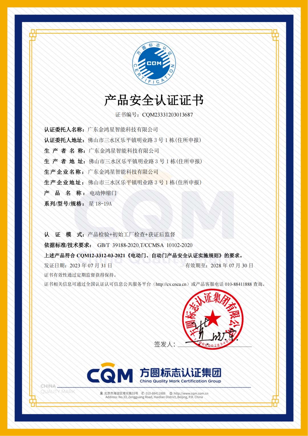 金鸿星产品经过一系列严格的审查及评审,顺利获得户外平移门以及电动伸缩门“产品安全认证”证书,不仅彰显了金鸿星在行业内的地位,更证实了金鸿星在产品安全上不断精进的实践与成果。金鸿星始终以产品安全与智能的发展为前提,不断对产品的性能进行持续升级,致力于研发高品质、安全与智能的放心产品,引领行业高质量高标准健康发展,给每一位选择金鸿星的客户都能买的放心,用的安心。