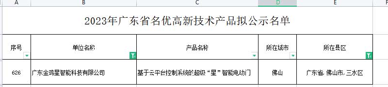 近日,广东省高新技术企业协会公示了《2023年广东省名优高新技术产品拟通过名单》,广东金鸿星智能科技有限公司研发的超级“星”智能电动门产品凭借卓越的创新和优异的性能,成功入选目录名单。