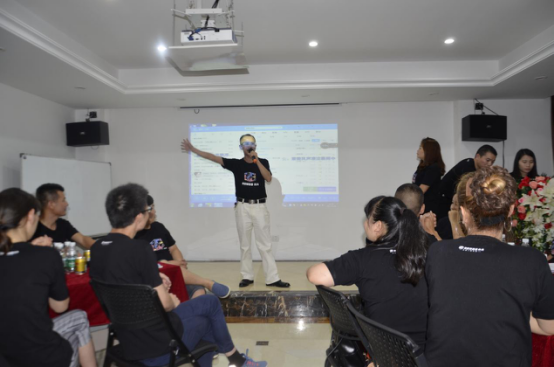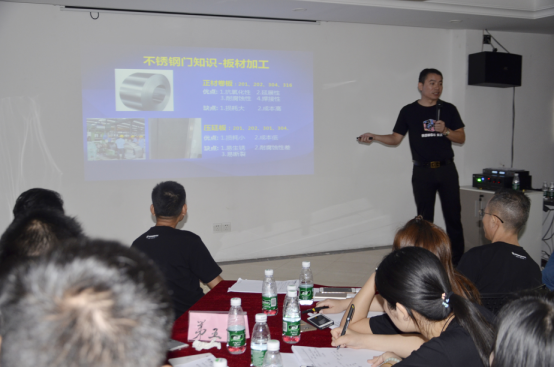 李总从产品的选材、工艺技能开始培训,入户门的每一个知识细节讲述可谓入木三分。细致的知识铺排专业性强,但又通俗易懂。课堂气氛群情激昂,学员兴奋不已,开心学习,快乐成长。