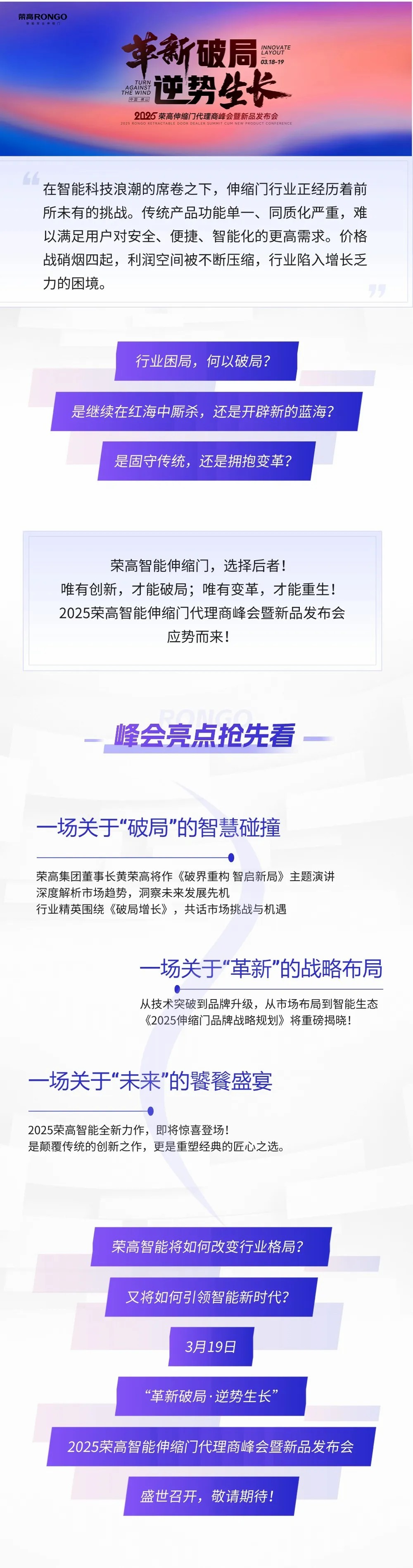 3月19日,“革新破局·逆势生长”2025荣高智能伸缩门代理商峰会暨新品发布会即将盛大启幕!