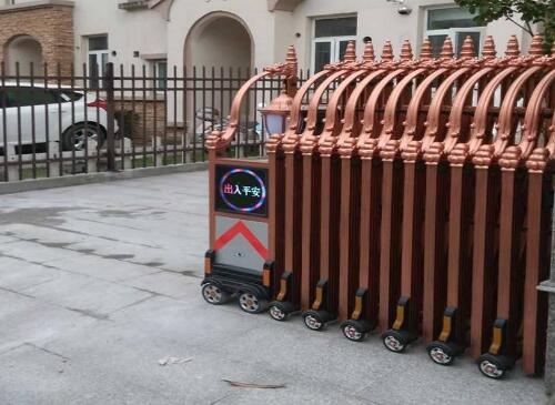 台州电动伸缩门的驱动器采用特种电机驱动,蜗杆蜗轮减速,并配有手动离合器,停电时可手动启闭,电动伸缩门的控制系统有控制板,按钮开关,另可根据用户需求配备无线遥控装置。电动伸缩门所采用的电机系特殊的专用涡轮蜗杆式电机,因为其传动原理特殊性,稳定性高,输出力矩大、噪音小,速度适中。门体整体为金属结构,按材质又分为不锈钢门体、铝合金门体、压铸铝门体。2、机头:由驱动器和电气部分组成,它固定在门体的一端,带动门体伸缩运动,与门体配套使用。驱动器分普通型和机器人型。3、控制器:由控制盒、台式控制器及手柄遥控器组成。1)、控制盒:固定在机头内,由它接收控制器发出的指令控制门体的运行。2)、台式控制器:主要由值班人员在值班室内使用。3)、手柄遥控器:主要配备车辆使用,可在机头周围10-30米内(根据现场的无线电通讯环境而定)活动控制大门的开、关。