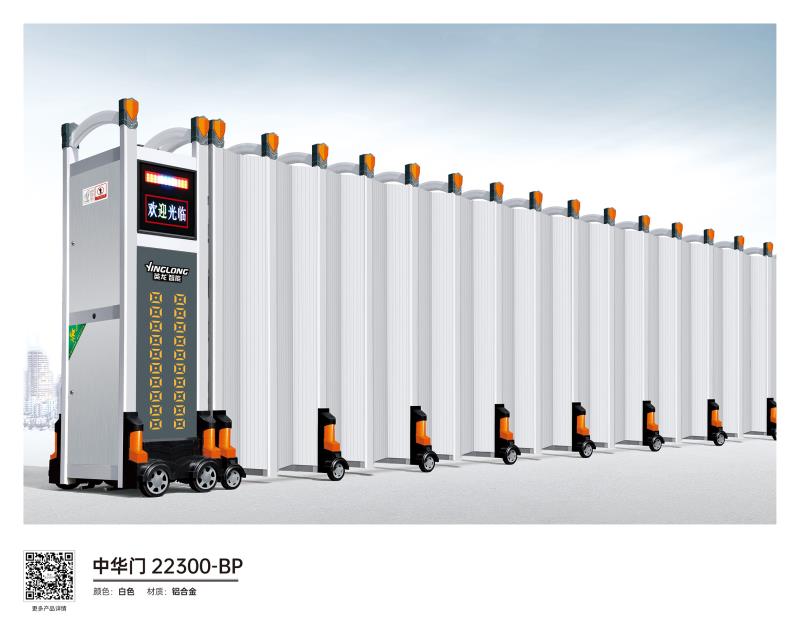 光明新城小学的英龙中华门22300系列伸缩门,主料和交叉料均采用厚度2.0mm铝材,装饰头采用高强度铸铝件,整体结构坚固实用。外形线条流畅。以低调高级灰,白为主色,更具简约高端。表面为阿克苏粉末喷涂上色工艺,防寒耐晒。驱动轮和行走轮均采用铸铝航空橡胶轮,具有很强的抓地力和承重力,使用寿命是普通轮子的5倍。门排轮轴采用304不锈钢轴,不生锈不卡轮,丝滑开启。