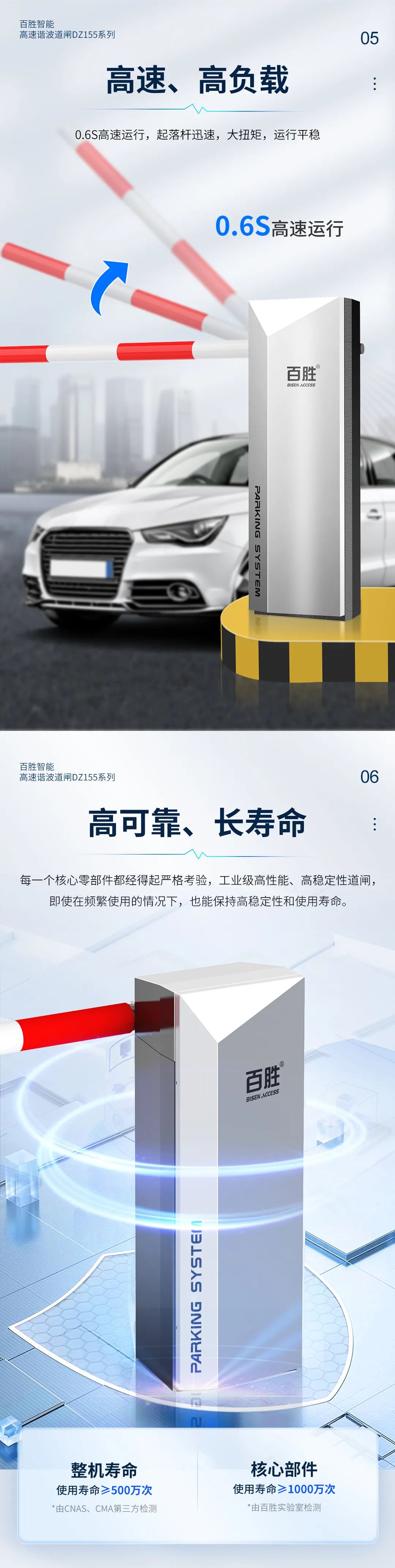 高速、高负载:0.6S高速运行,起落杆迅速,大扭矩,运行平稳