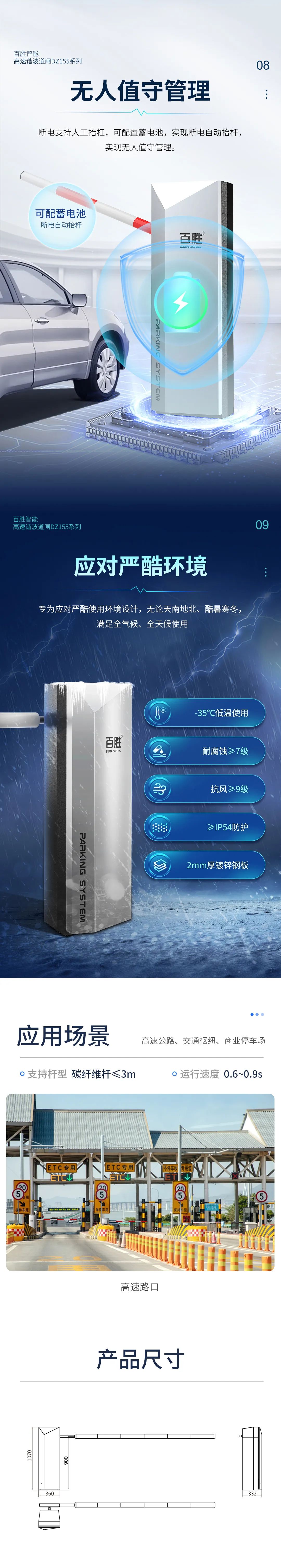 无人值守管理:断电支持人工抬杠,可配置蓄电池,实现断电自动抬杆,实现无人值守管理。
