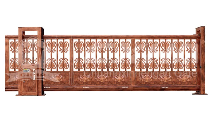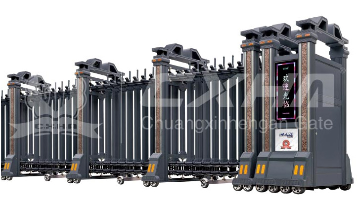 CD-07、08、09、10伸缩门系列:底部四排卧式榄枝,四平八稳,抗风能力强,有效地解决门被大风吹倒的问题。