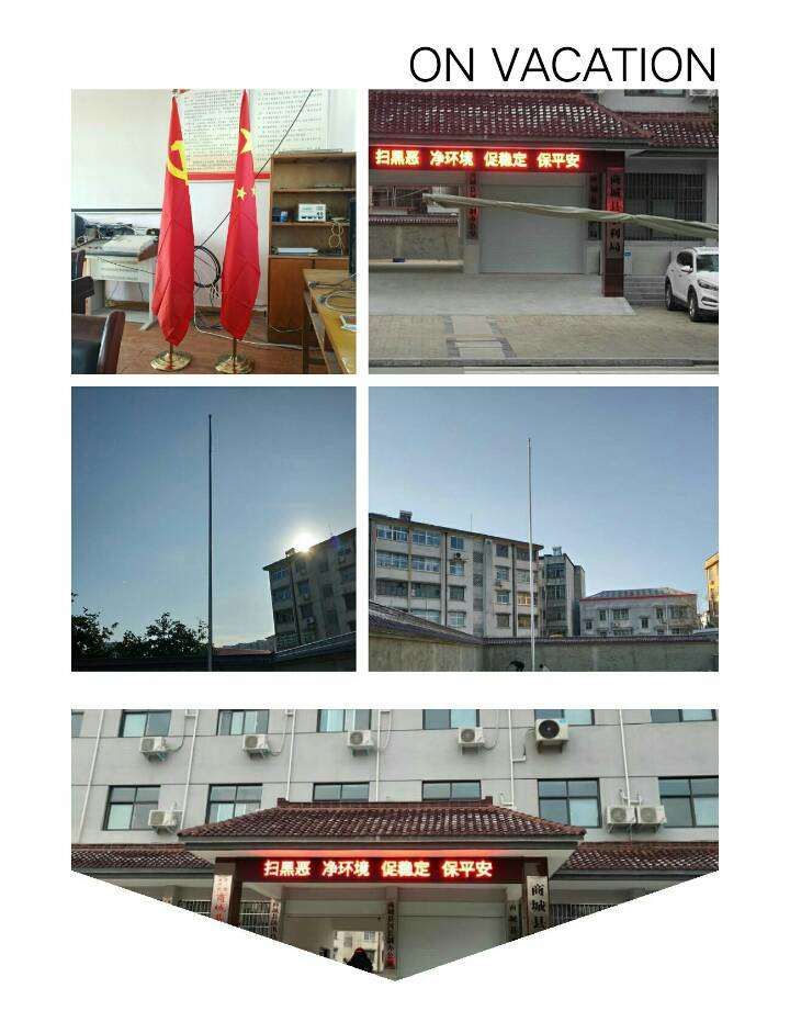 本厂家主要生产的不锈钢旗杆、酒店旗杆、锥形旗杆、水平旗杆、电动旗杆,通过采用SUS304SUS316SUS201优质不锈钢制作,旗头可360度顺风自由旋转,这样避免了国旗缠绕在旗杆上。不锈钢绳内藏于旗杆内,旗杆外无旗绳,这样避免旗绳缠绕在旗杆上。锥形旗杆和三节旗杆有内置旗杆,外置旗杆,风动旗杆。主要用于公司、酒店、政府、部队、广场、体育馆,学校等单位。