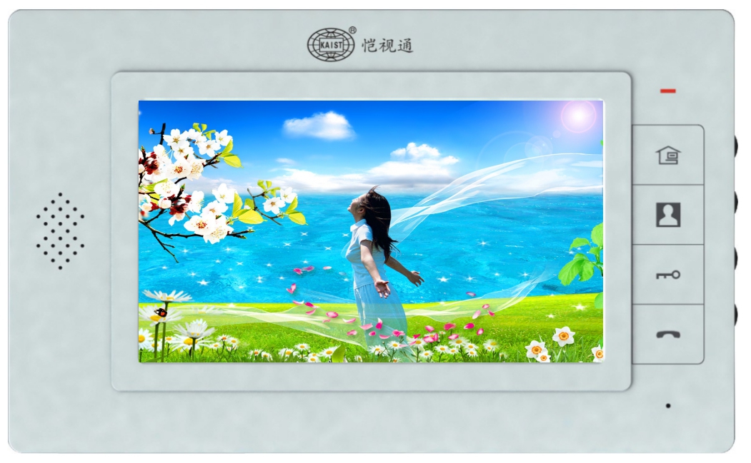 ABS全新料,高档美观,免提式可视分机,7寸液晶宽屏显示;具备对讲、开锁、监视、呼叫管理中心等基本功能;向管理中心紧急报警功能;16种和弦音乐铃声选择功能;技术参数;外形尺寸:245*150*23mm;振铃声:≥70db ;功耗:待机时 12mA 通话时500m;工作环境:-10~+50℃,湿度≤90%;线材电阻:≤10欧姆;信噪比:≥35db ;音频响应:300~3000HZ ;谐波失真:≤5% ;工作电压:DC18V±10%;视频输入:1.0VP-P75Ω;解晰度:1140×234