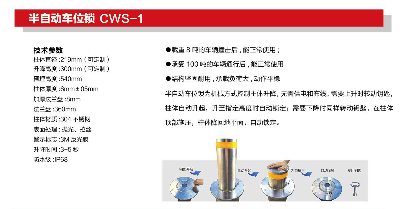 产品,请仔细浏览本页面。如您还有疑问,请拨打服务电话,我们将免费为您提供半自动车位锁 CWS-1的款式、价格、生产厂家、安装维修等方面的咨询服务。