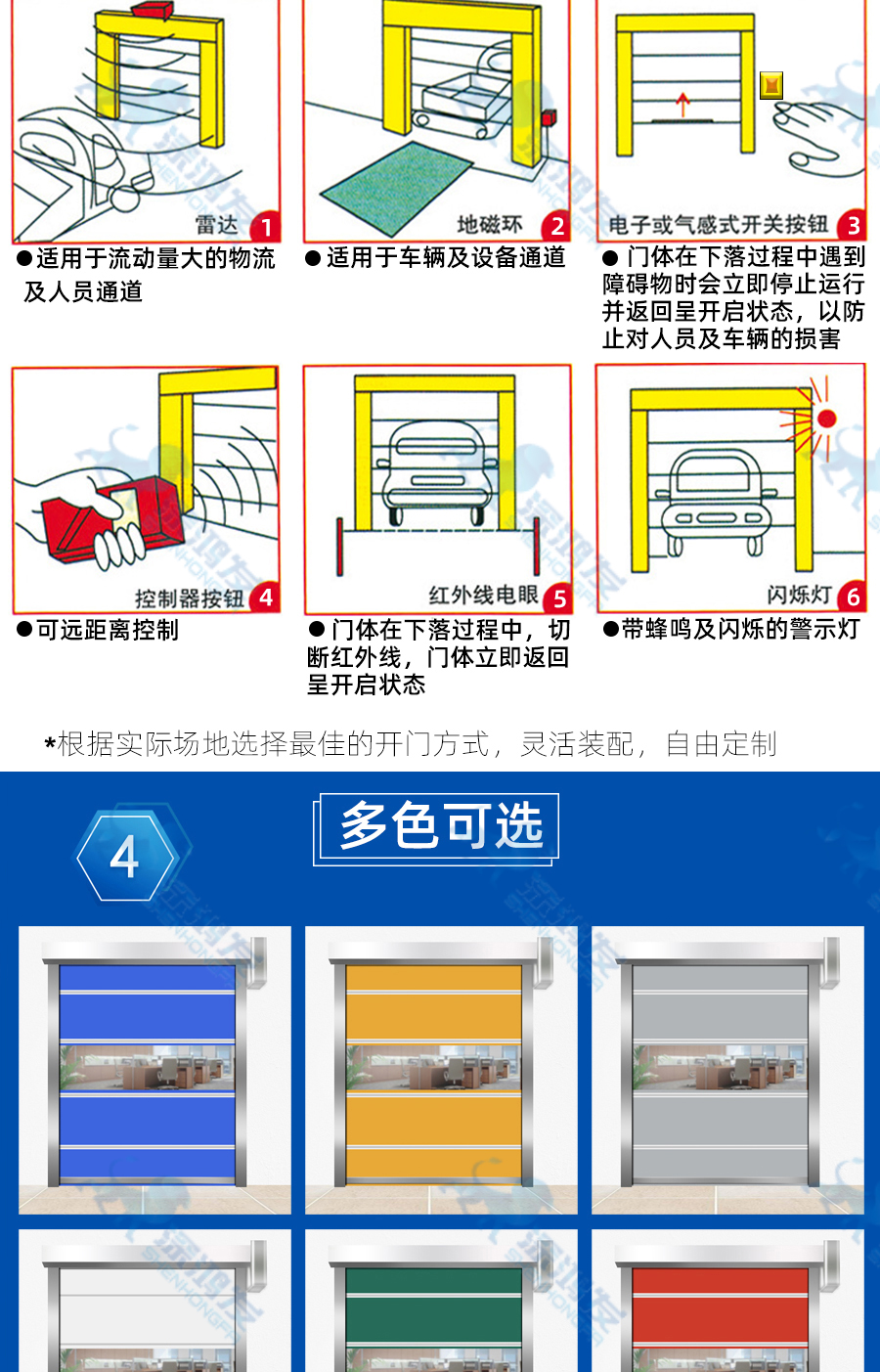 门帘材料:进口高密度聚脂纤维表面镀膜处理,厚度0.8mm-1.5mm,颜色各种选择