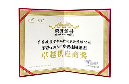 安居宝再次荣获“2018年度碧桂园集团卓越供应商”。这项殊荣离不开安居宝十年如一日的专注与专业,充分体现了碧桂园集团对安居宝的肯定以及对未来合作的信心。至此,安居宝与碧桂园集团建立全面深入,互利共赢的战略合作关系已达10余年。此外,公司“安居小宝”智能家居也受到了碧桂园的高度认可,目前为止,“安居小宝”智能家居已在碧桂园旗下1300余个楼盘推广使用。