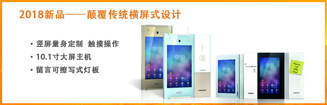 2018,安居宝以定制化的竖屏设计突破传统横屏设计,如平板电脑般挥洒时尚大气。为强调产品的多样化和定制性,巡展中带来新款10.1寸竖屏式主机和7寸竖屏终端,赋予灵动的品质打造,机身与面板融为一体,严丝密缝间如一镜面呈现,兼具的白色灯板透光设计,具备可擦写式留言及夜光照明功能,实用与时尚并举。