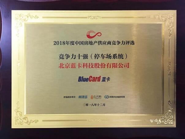 2018年度中国房地产供应商竞争力评选“竞争力十强(停车场系统)”