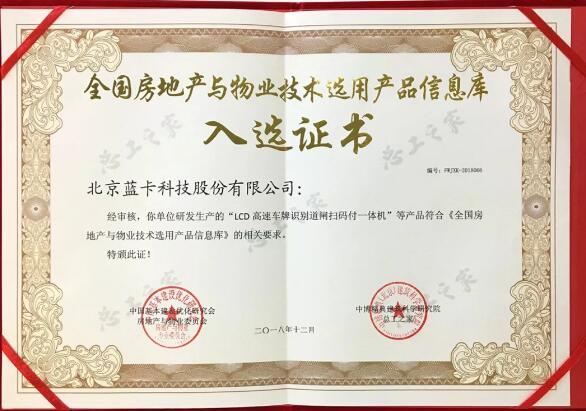 本次大会专家汇聚,大咖云集,众多地产领域知名企业负责人相聚一堂,共同为我国房地产领域技术革新、建设生态节能项目、分享创新,共同缔造了一场行业盛宴。蓝卡科技作为一家专注于停车场系统解决方案提供商,凭借强大的产品研发、平台开发能力,利用自己多年在停车场细分领域的数据积累和AI云技术应用经验,满足了地产行业对智慧停车一体化设计与运营的需求。经过审核,蓝卡科技LCD高速车牌识别道闸扫码付一体机产品成功入选“全国房地产与物业技术选用产品信息库”。