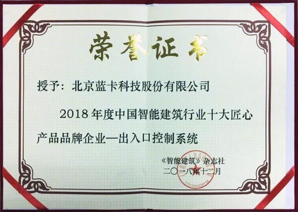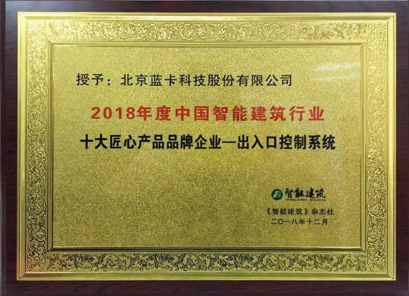 此次参与评选的企业都是来自全国有实力的智能建筑领域企业,经过层层选拔,蓝卡科技最终获得“2018智能建筑十大匠心品牌奖牌”奖项,这也是业界对蓝卡科技为停车场行业做出的突出成绩的充分肯定。