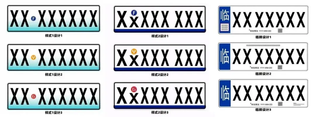 从公布的资料来看,新型号牌蕴含的信息比以往的车牌更多。两类小型汽车号牌颜色分别有白底蓝条黑字和白底蓝条渐变黑字,号段共有8个,同时增加了圆形字母图案,分别有蓝、橙、红三种颜色且内含“F”、“Y”、“G”三个字母。另外,临时行驶车号牌为左侧蓝底白字的“临”字,右侧号段有7个,白底黑字,同时带有二维码。