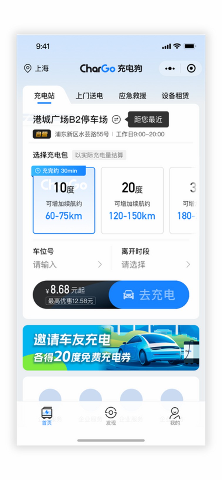 充电狗提供20kw的快充服务,补电半小时,续航百公里!
