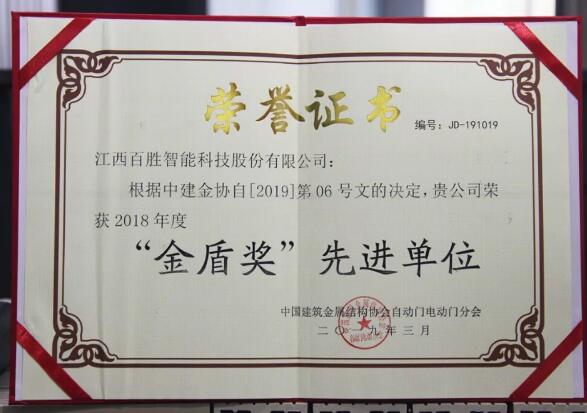 本次会议,江西百胜智能科技股份有限公司因杰出的行业贡献、突出的安全电压标准化工作而荣获:《安全电压开门机》团体标准主编单位、《户外电动门安全要求》团体标准主编单位、2018年度全国自动门电动门行业金盾奖。