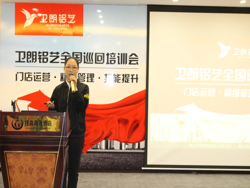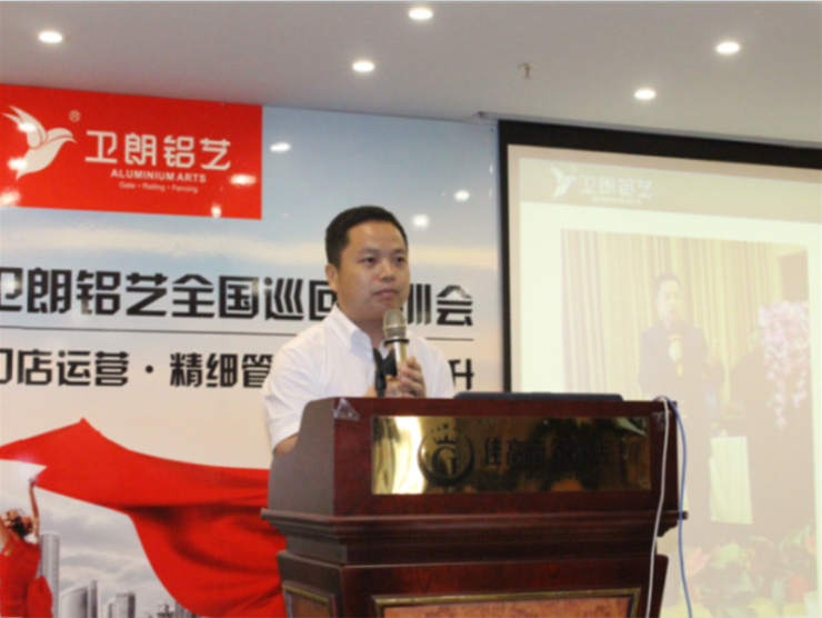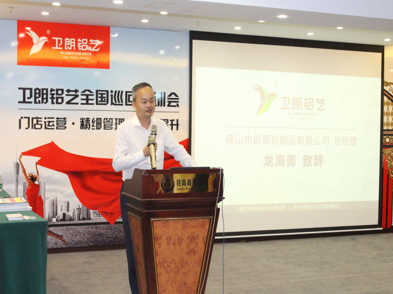 会议伊始,龙总上台致辞,他首先回顾了卫朗铝艺全国巡回培训会过去几站的情况,表示每次对培训会的举行都深有感触,并对远道而来的嘉宾表示欢迎。随后龙总阐述了佛山站培训会的宗旨,龙总强调2017年卫朗铝艺将继续坚持提高产品品质、扩大品牌影响力、提升服务水平,坚定不移地打造铝艺“星”标准!
