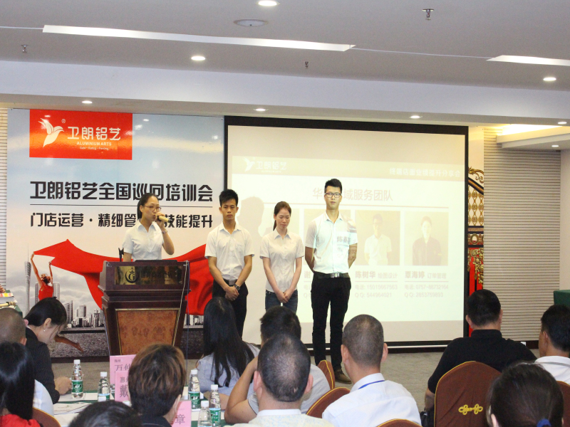 平时,分管全国各大区域的卫朗铝艺服务团队常年冲锋在第一线,对终端进行精准帮扶。这一次佛山站培训会上,华南大区经理陈春连带领她的团队成员集体亮相,并依次自我介绍,与本区域的经销商们来一次亲密接触。