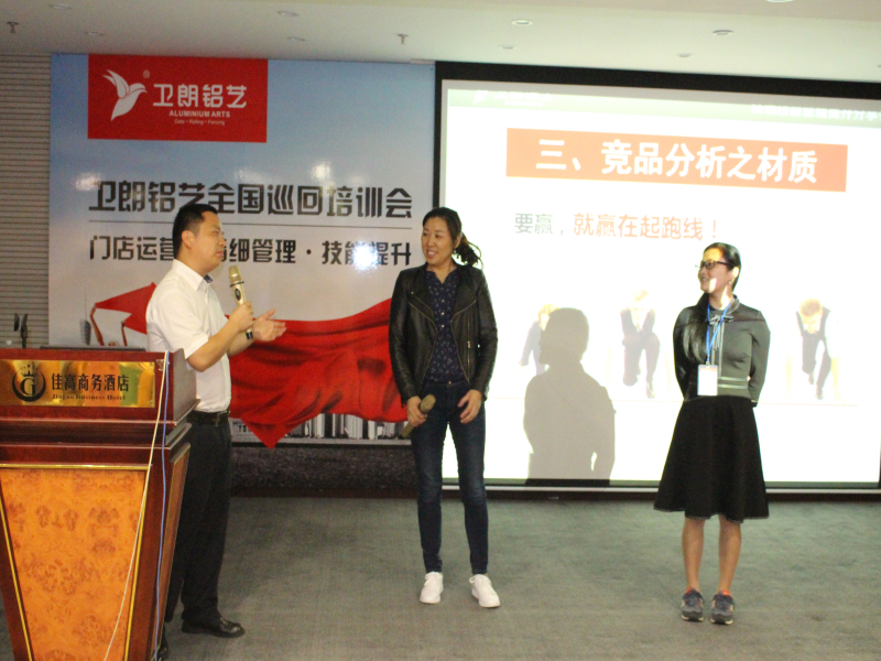 随后,吴总监从卫朗铝艺产品知识、竞品情况、铝艺行业现状等方面进行了深入阐述,详细剖析了卫朗铝艺从产品设计、铝材选择、结构工艺、表面处理等方方面面的优势,使在座经销商卫朗铝艺产品有更深入的了解,纷纷发表听后感。期间,吴总监还与现场经销商进行有奖问答互动,众多经销商踊跃参与,热情高涨。