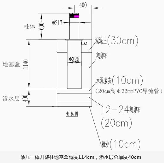 本次液压一体升降柱安装案例,采用渗水层自然渗水方式排水。