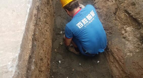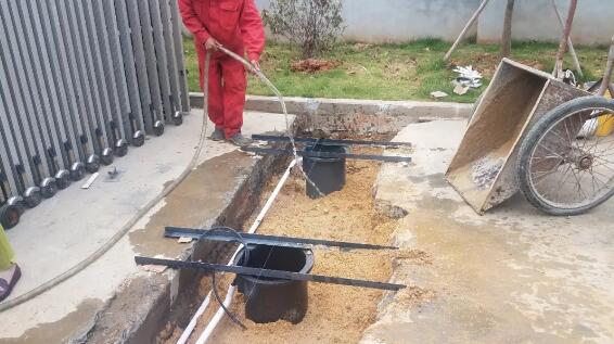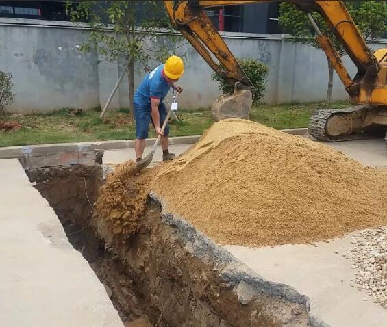 回填砂石,回填至距离地面30cm左右,浇水沉降2小时候后夯实。