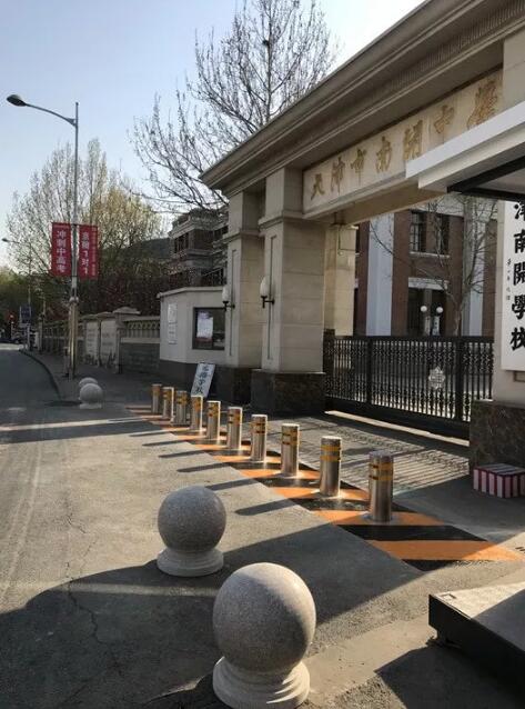 南开中学所有的校园出入口都配备升降地柱守护,有效防范车辆冲撞事故的发生。