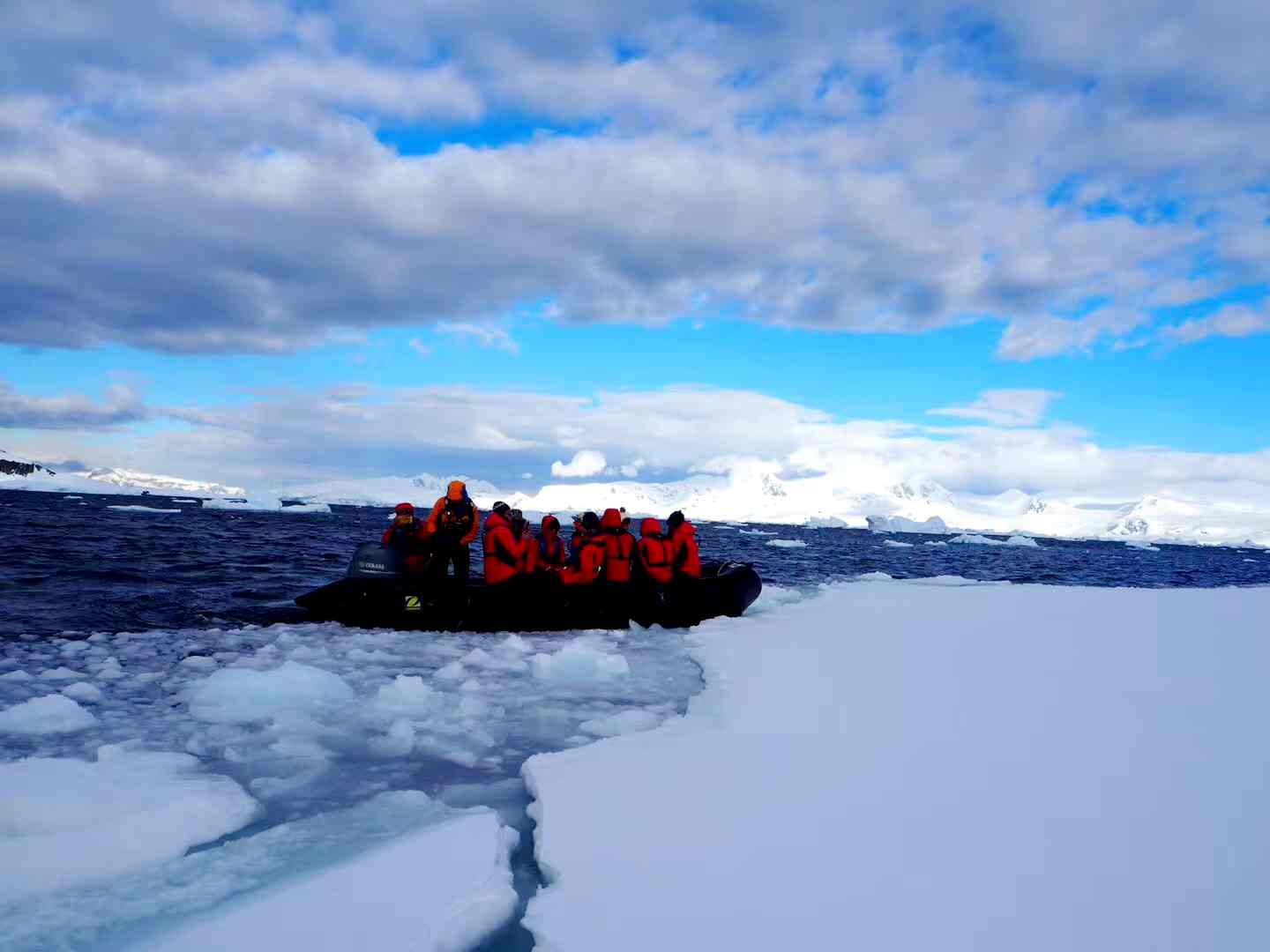 早上6点,探险队乘坐冲锋艇巡游南极奋进岛,近距离亲近大海,考察冰山。