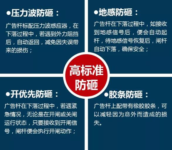 具有遥控开关、延时落闸功能,安装空气压力波感应器,关闸时避免砸车、砸人;