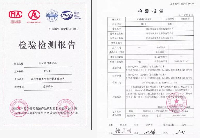 检测结果2:由深圳市旺龙智能科技有限公司委托并受检的ITL-DJ型云对讲门禁主机,经本中心检测的项目共计11项。所检项目的检测结果符合ITL-DJ-001《云对讲门禁主机技术要求》、GB/T31070.1-2014《楼寓对讲系统第1部分:通用技术要求》(参照)的相关要求。