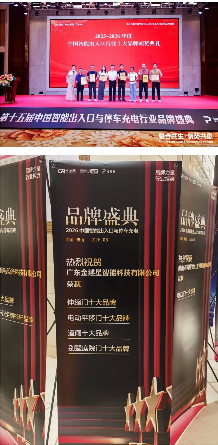 第十五届智能出入口与停车充电行业颁奖盛典在佛山顺利召开。在会上建星荣获“电动平移门十大品牌”、“伸缩门十大品牌”,“道闸十大品牌”“庭院别墅门十大品牌“战略合作伙伴”等几项大奖。