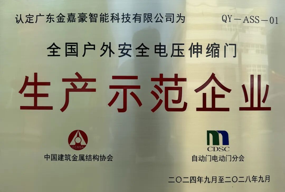 祝贺广东金嘉豪智能科技有限公司获得“全国户外安全电压伸缩门生产示范企业”认证