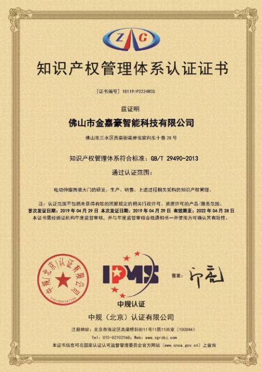 近日,佛山市金嘉豪智能科技有限公司荣获中规(北京)认证有限公司颁发的“知识产权管理体系认证证书”,证书编号:18119IP2224R0S,认证范围:电动伸缩门围墙大门的研发、生产、销售、上述过程相关采购的知识产权管理。