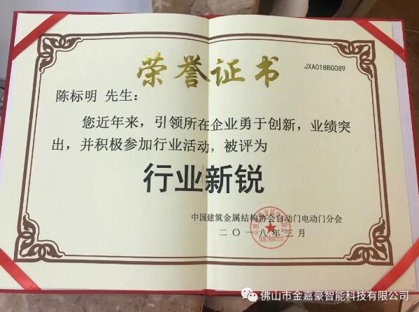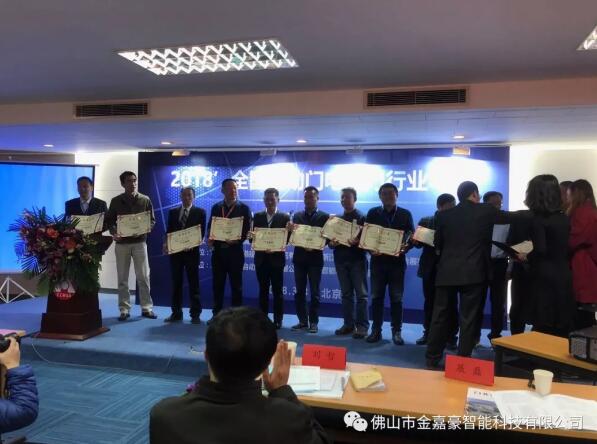 3月7日,2018全国自动门电动门行业年会颁发“行业新锐”荣誉证书和颁奖留念