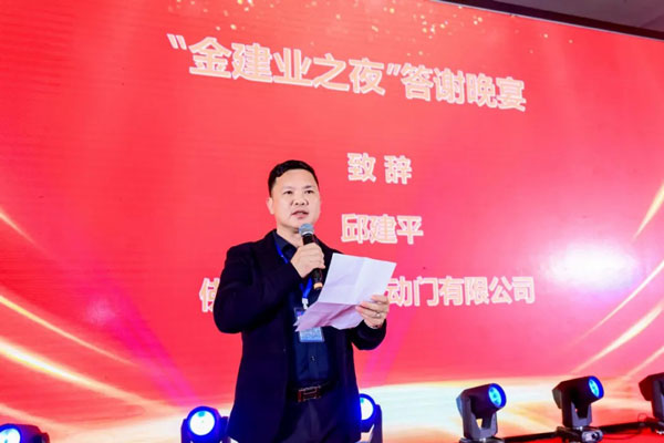 在晚宴中,广东佛山市金建业电动门有限公司的创始人邱建平发表了重要的年会致辞: