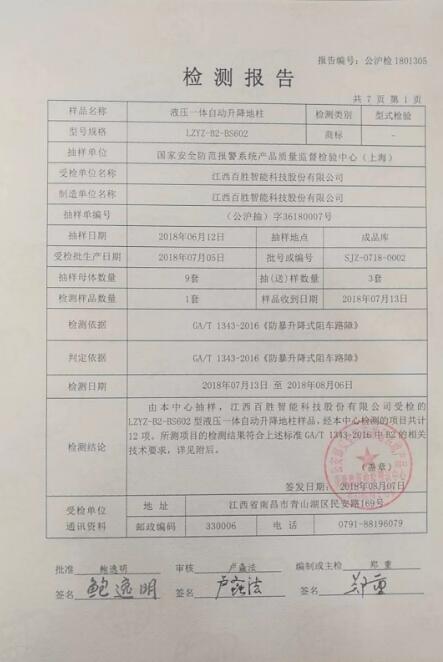 近日,公安部第三研究所的国家安全防范报警系统产品质量检测监督中心(上海)、公安部安全防范报警系统产品质量监督检验测试中心,参照公安部GA/T1343-2106 《防爆升降式阻车路障》,对百胜液压一体自动升降地柱进行了检验。