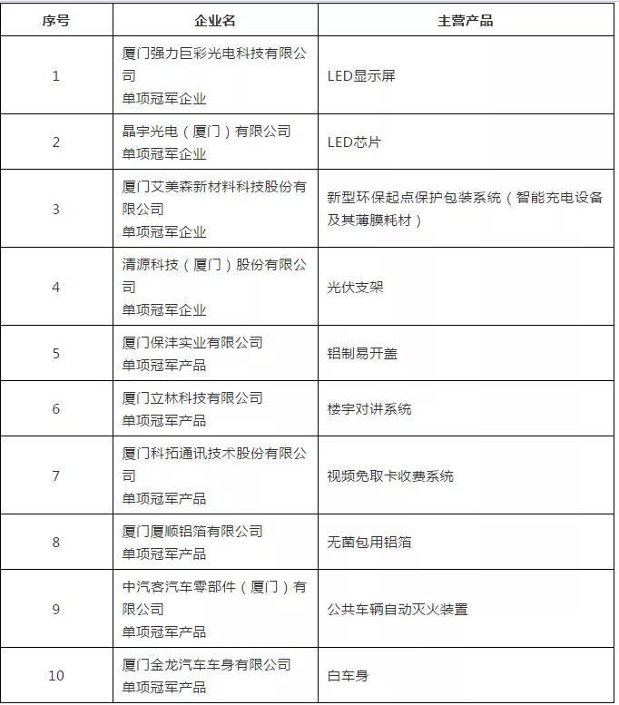 福建省第三批制造业单项冠军(产品)一览表(厦门)