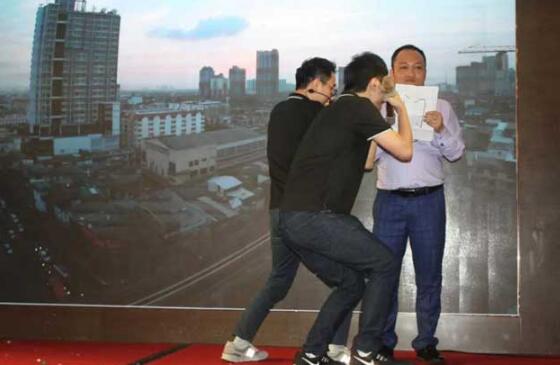 二队“队长”刘总迈开步伐,左蹦一下,右跳一下,队员终不负“众望”,脱口而出“左蹦右跳”;三队“队长”张总以手比“角”,“哞哞,哞哞”,模仿起牛的叫声,不一会儿他又手指作抚琴状,一副“对牛弹琴”的画面跃然眼前,观众早已起身围拢过来,欣赏张总惟妙惟肖的即兴表演,掌声和欢呼声此起彼伏。在领导和员工们投入的表演中,令令家族上下一心,其乐融融。