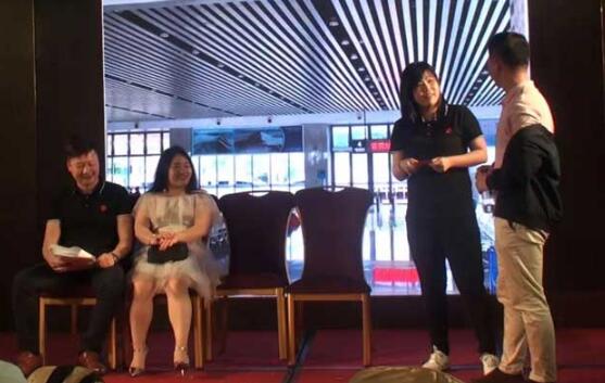 当大家还沉浸于上一个表演情景中时,游戏互动分场主持皮总监早已按捺不住内心的激动,他迫不及待地上台找回属于自己的“场子”,宣读着游戏规则和奖励,台下早已蠢蠢欲动。在游戏《快乐传真》环节中,三位“队长”分别抽到“坐立不安”、“左蹦右跳”和“对牛弹琴”。在众目期待中,一队“队长”程总早已进入表演情境,他时而坐下,拍着腿,低头叹息,时而站起来,抬头仰望,抓耳捞腮,情景演绎一传二、二传三,当第五个人看着前一位队员的表演时,愣了半天,才说道——坐井观天,引得台下哄然大笑。
