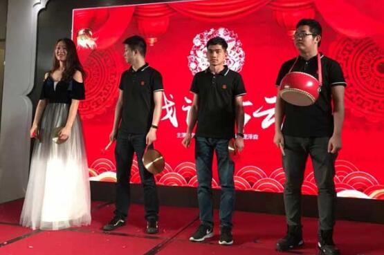 研发部和市场部分别带来《三句半》表演,朗朗上口的台词,间以锣、鼓、钹、碰铃等赋予节奏感的乐响,将观众带入故事氛围中。