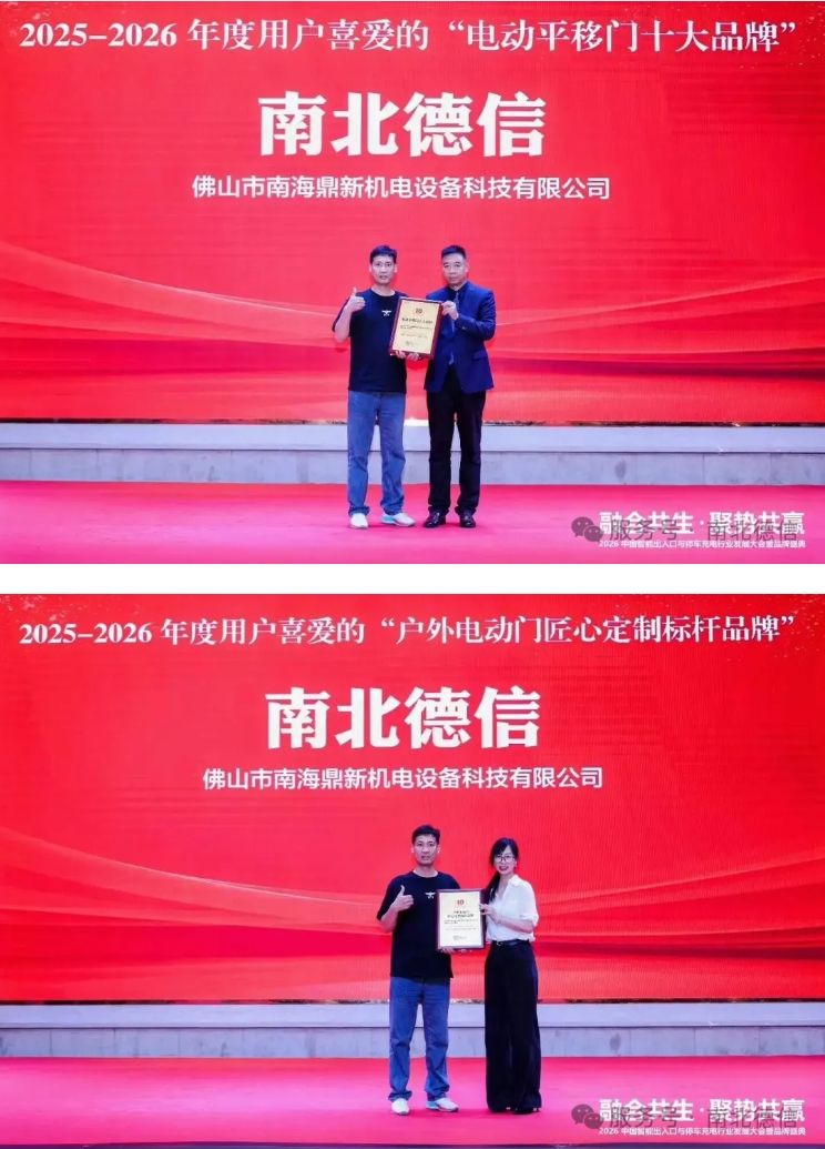 在刚刚落幕的第十五届中国智能出入口与停车充电行业品牌盛典上,南北德信凭借超强的技术创新能力和严苛的匠心品质,斩获了2025-2026年度“电动平移门十大品牌”和“户外电动门匠心定制标杆品牌”两项荣誉。