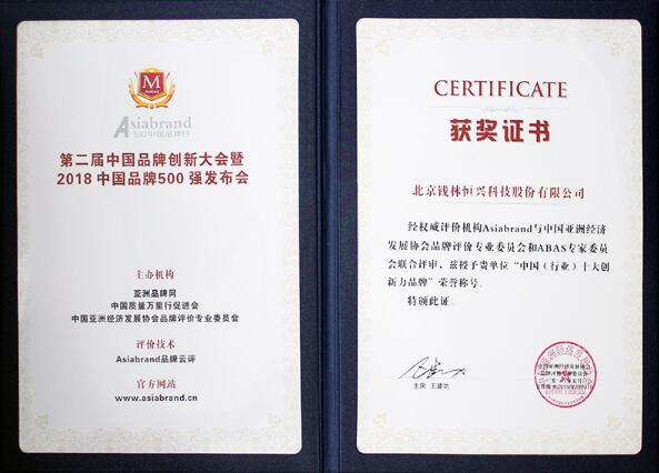 大会期间,隆重揭晓了“2018中国品牌500强、中国品牌日年度人物大奖、中国品牌年度创新人物、中国十大工匠品牌、中国十大创新力品牌”等榜单和奖项,并举行了隆重的颁奖仪式。北京钱林恒兴科技股份有限公司(证券代码:871112)凭借其超强的技术创新能力,以及技术创新成果转化能力,成功摘取“中国(行业)十大创新力品牌”殊荣!
