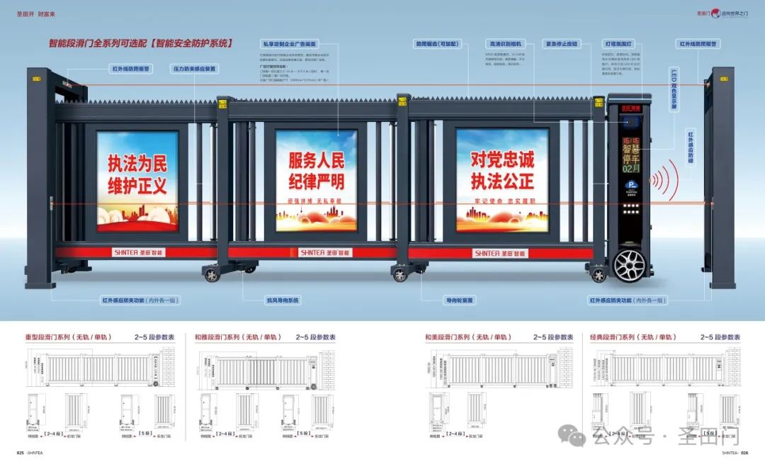 智能段滑门全系列可选配的【智能安全防护系统】。红外线防爬报警为您的企业构筑起坚固的安全防线。机头红外感应防碰和门体的压力防夹感应装置完美协同,无论是在运行过程中遭遇障碍物,还是门体关闭时感应到压力,都能迅速做出反应,有力确保人员和物品的安全。红外感应防夹功能(内外各一组)搭配高清识别相机,不仅贴心呵护每一次通行,有效避免夹伤事故的发生,还能精准识别来访人员和车辆进出,为您对大门的管理更高效便捷。