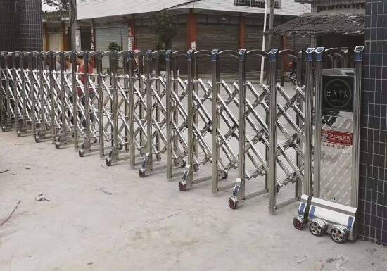 绍兴伸缩门门体采用优质不锈钢及铝合金专用型材制作,采用平行四边形原理铰接,伸缩灵活行程大,给峰泽景园项目不一样的体验。